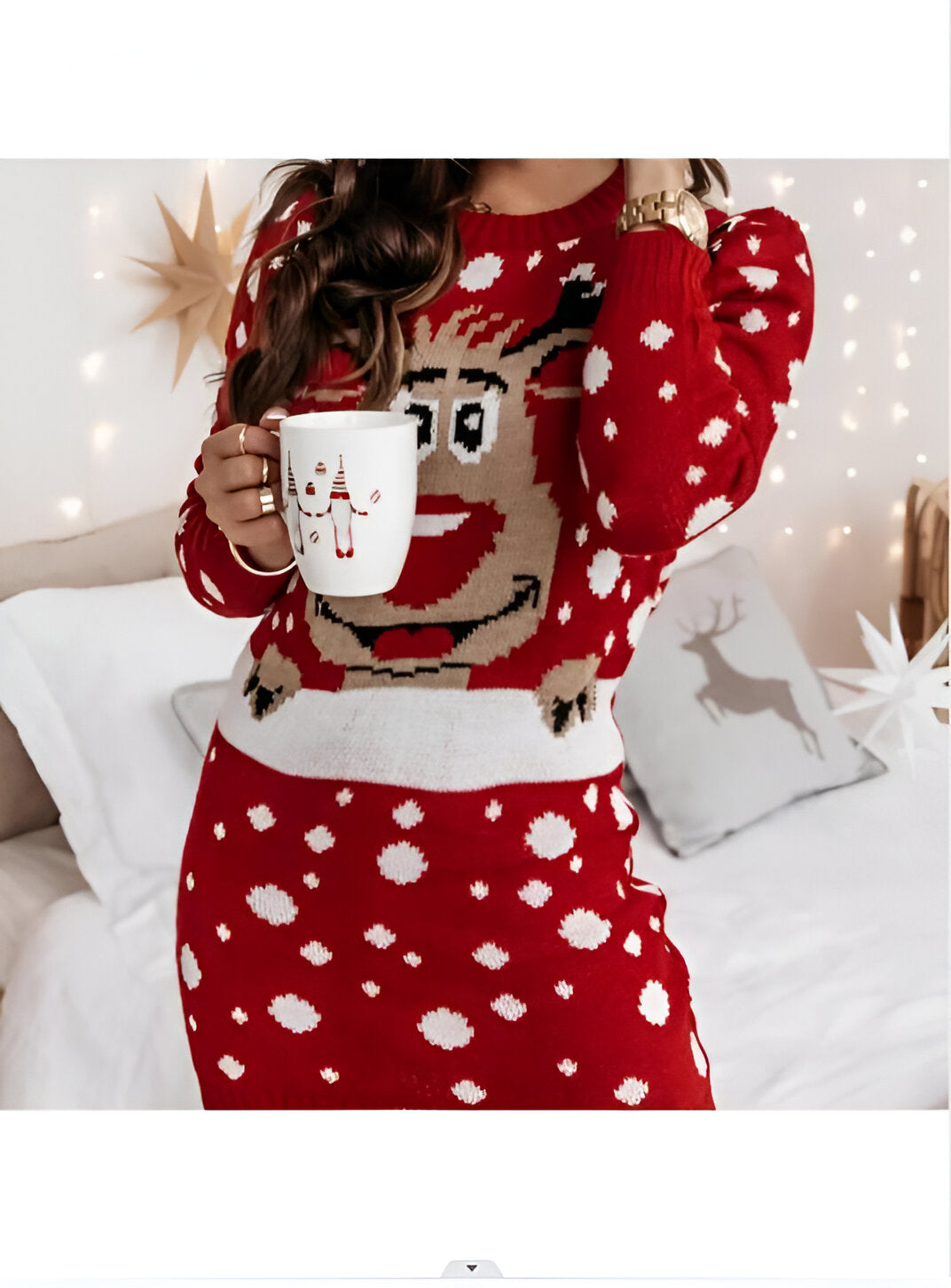 Mit dem festlichen roten Häkel-Design und dem Jacquard-Strick kombiniert dieses Kleid gemütliche Wärme mit einem stilvollen Feiertags-Look. Es ist das perfekte Kleid, um auf jeder Weihnachtsfeier oder festlichen Veranstaltung einen bleibenden Eindruck zu hinterlassen.