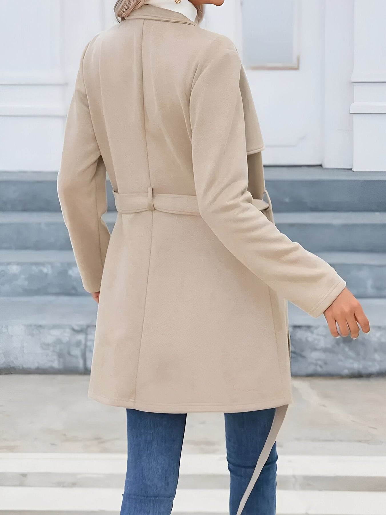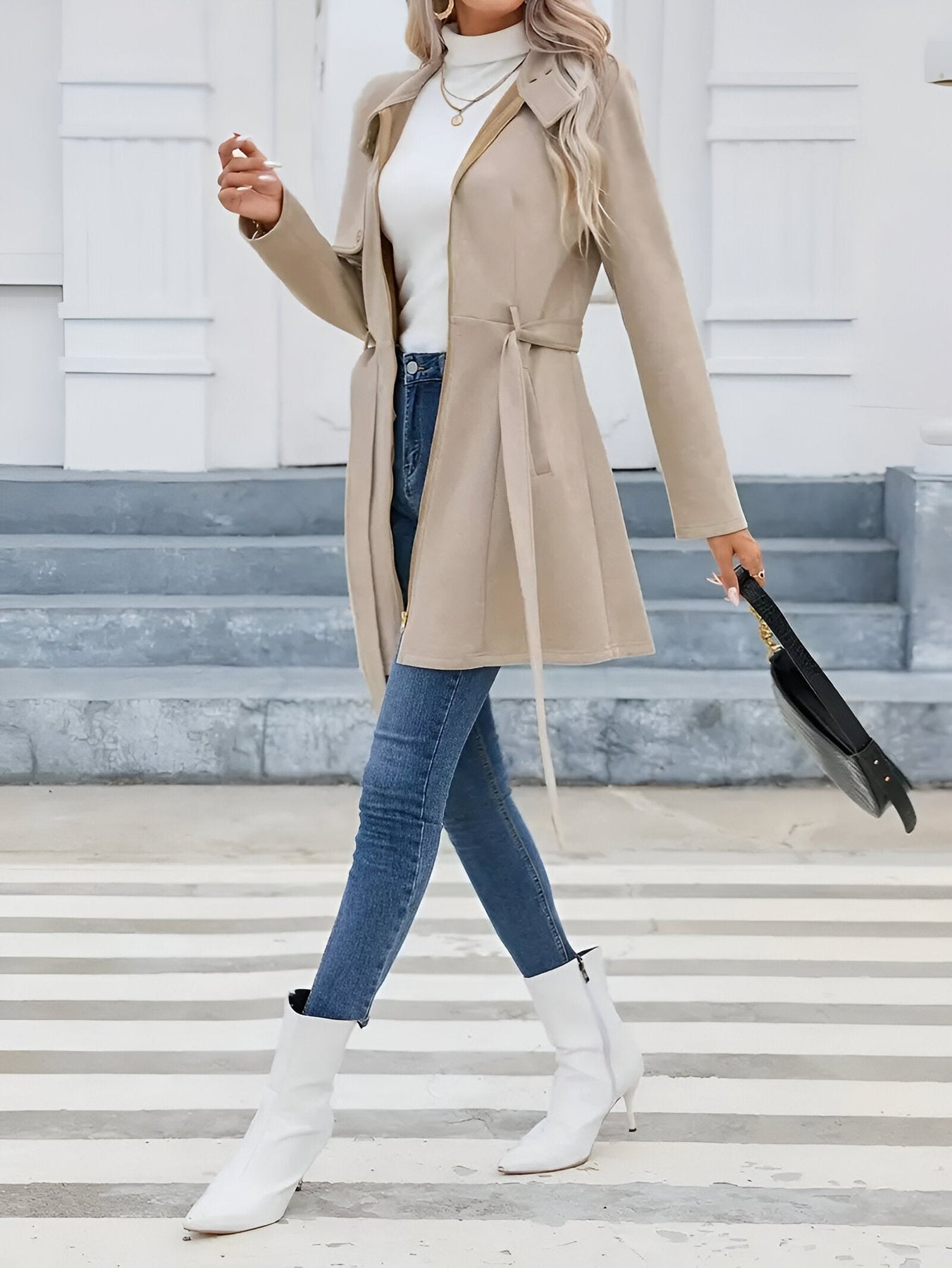 Stell dir vor, du trittst an einem kühlen Morgen nach draußen, umhüllt von einem Mantel, der dir sowohl Wärme als auch einen eleganten Look verleiht. Der schlichte Standkragen und der schmeichelhafte A-Linien-Schnitt schaffen eine zeitlose Silhouette, während der Gürtel an der Taille deine Figur betont. Dieser Mantel ist nicht nur dazu da, dich warm zu halten – er lässt dich stilvoll und selbstbewusst auftreten, wohin auch immer du gehst.
