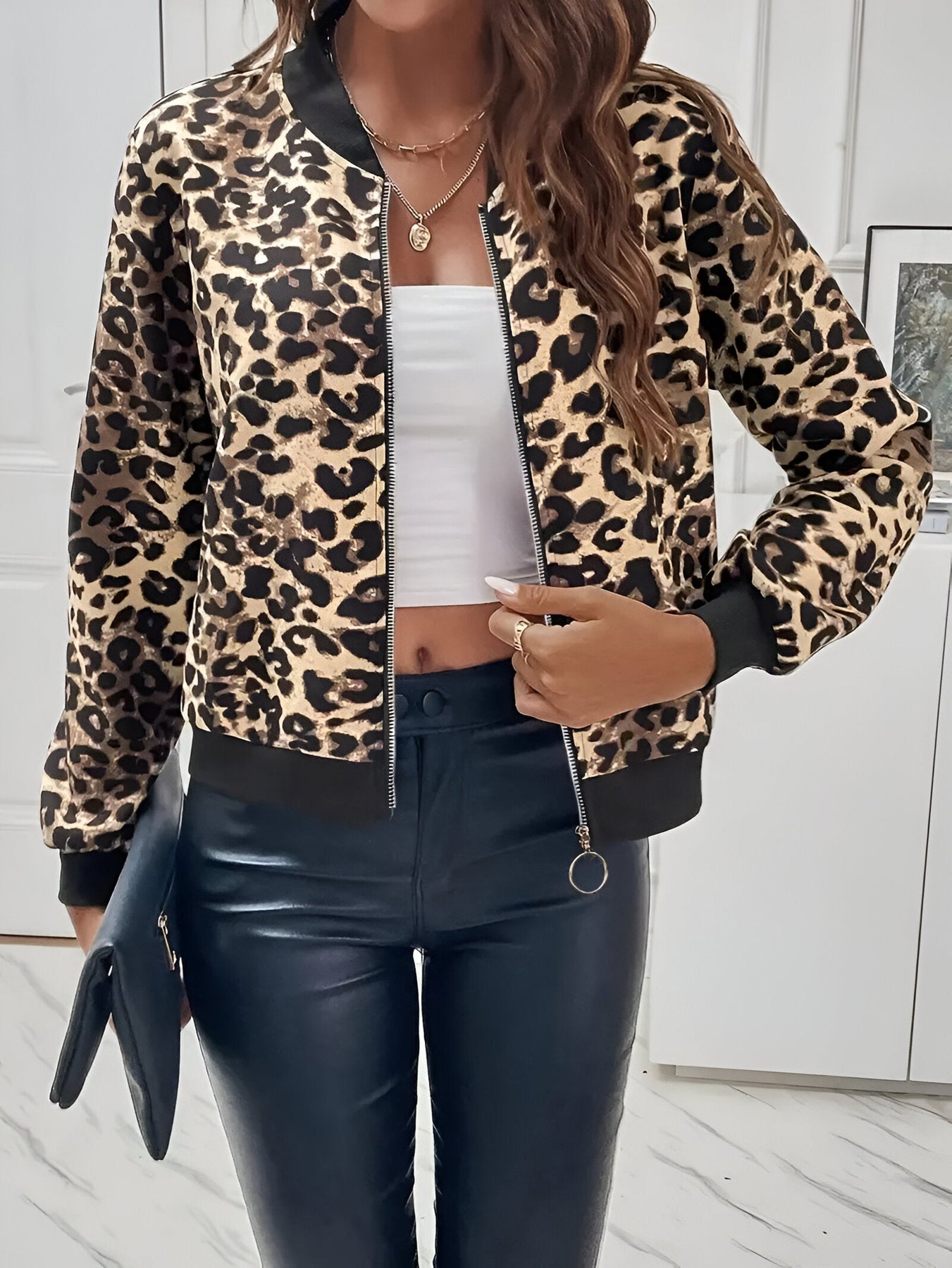 Stell dir vor, du gehst an einem frischen Herbstmorgen nach draußen, eingehüllt in eine Jacke, die gewagte Mode mit zeitloser Eleganz verbindet. Das auffällige Leopardenmuster und das elegante Zip-Up-Design verleihen deinem Alltagslook eine edgige Note, während die Kontrastpaspel einen modernen, schicken Touch hinzufügt. Perfekt zum Layern in den Übergangsmonaten – diese Jacke ist dein Go-to für Stil und Komfort.
