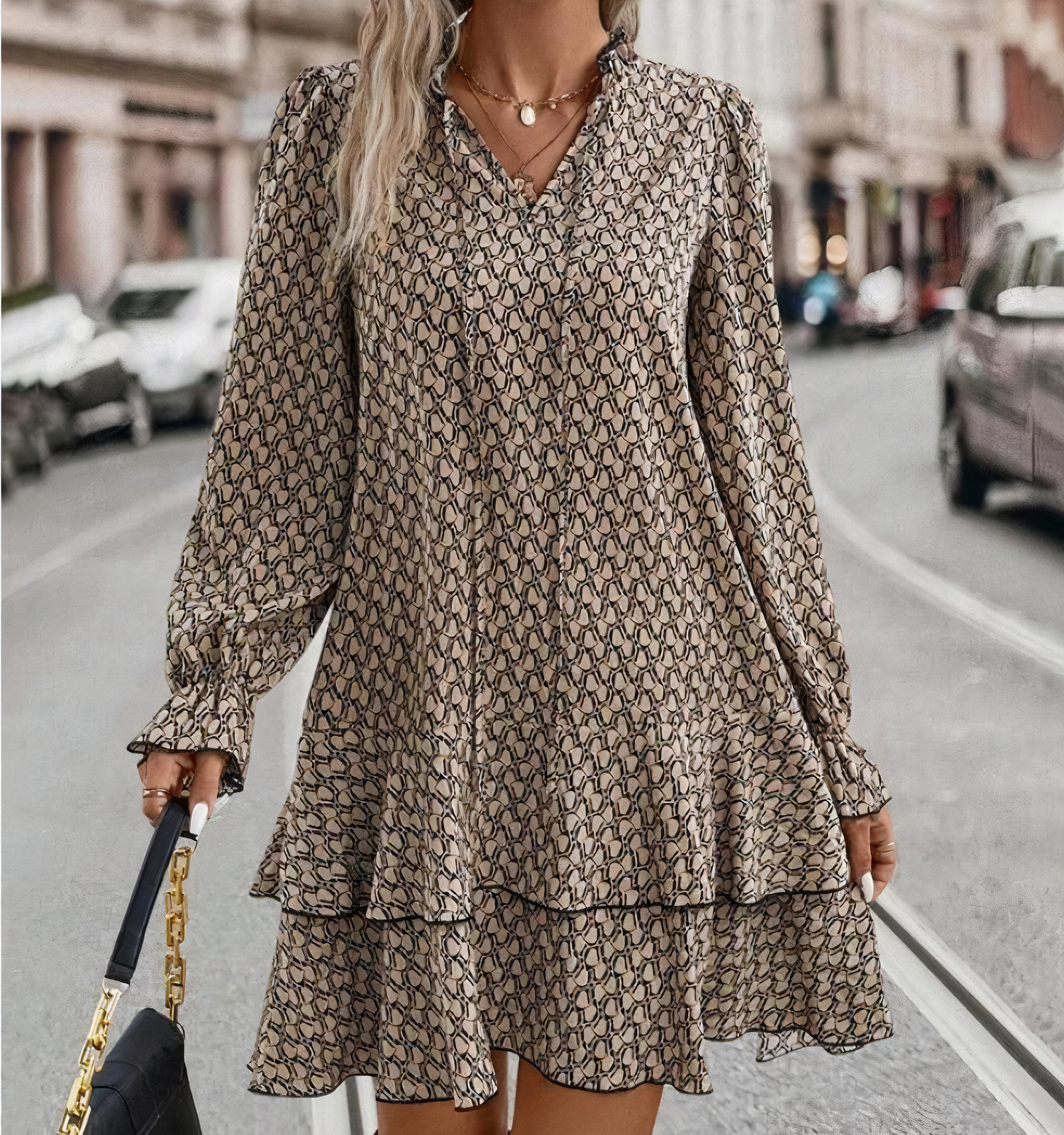 Tauchen Sie ein in eine Welt voller Charme mit unserem V-Ausschnitt-Kleid! Dieses stilvolle Kleid vereint die zeitlose Eleganz eines V-Ausschnitts mit einem verspielten und wilden Charakter, was es zu einem absoluten Must-Have für Ihre Garderobe macht. Mit seiner schmeichelhaften A-Linien-Silhouette, die Ihre Kurven betont, und dem auffälligen Leopardenprint zieht es alle Blicke auf sich. Dank der langen Ärmel ist es zudem für kühlere Tage geeignet und kann das ganze Jahr über getragen werden.