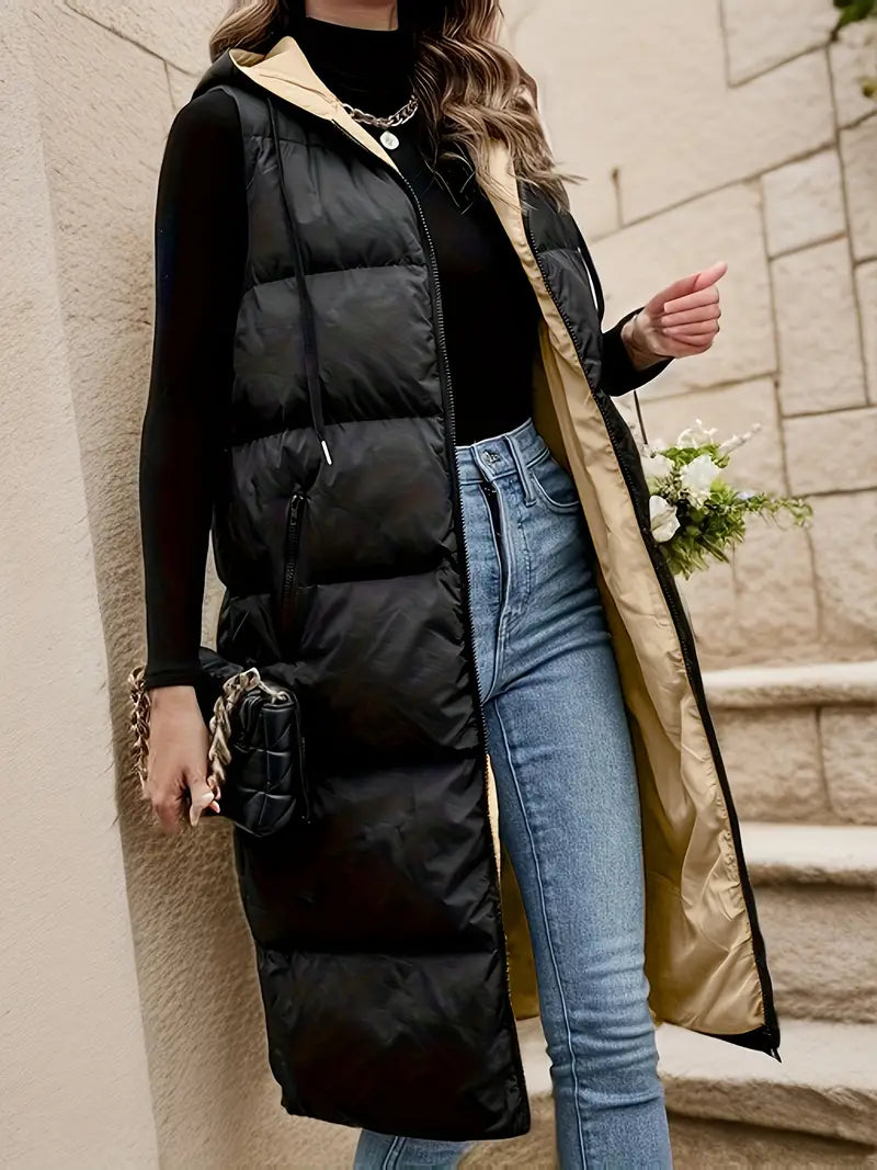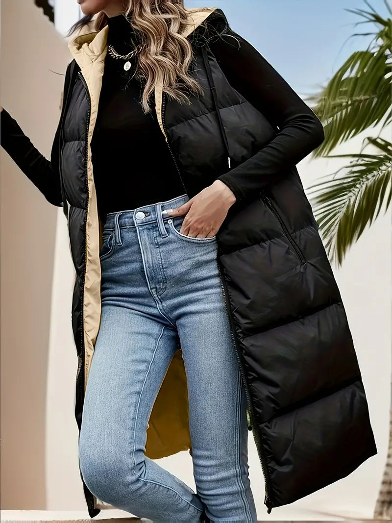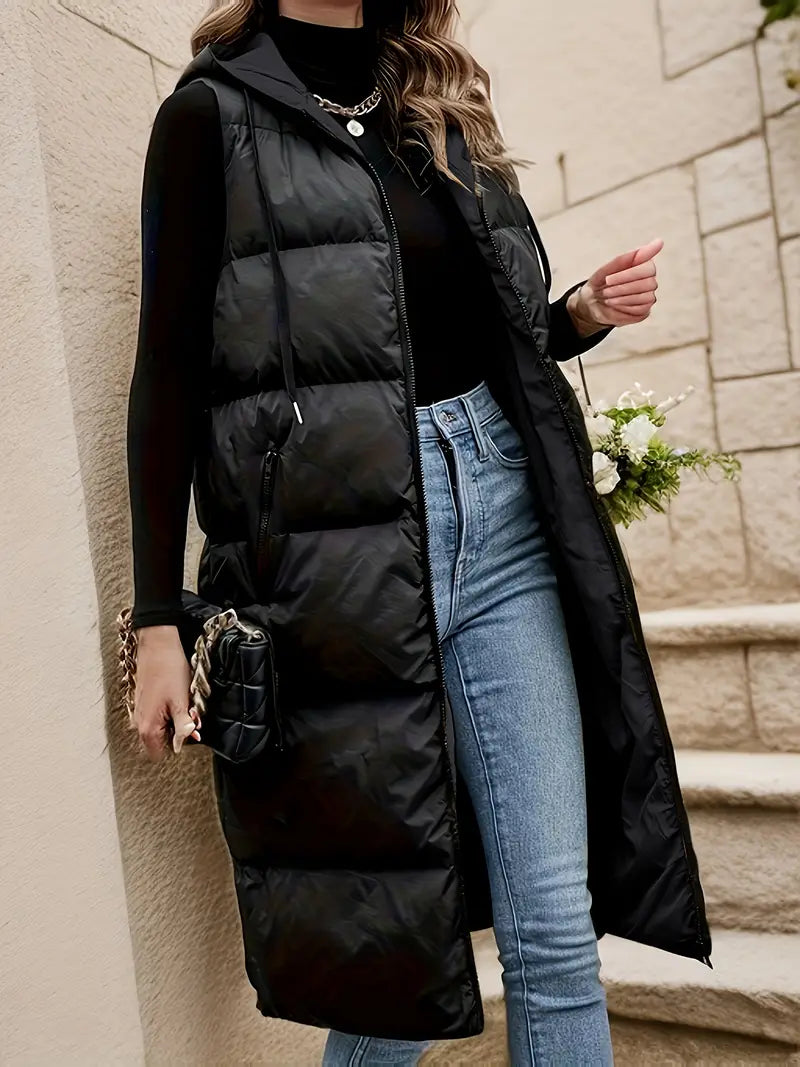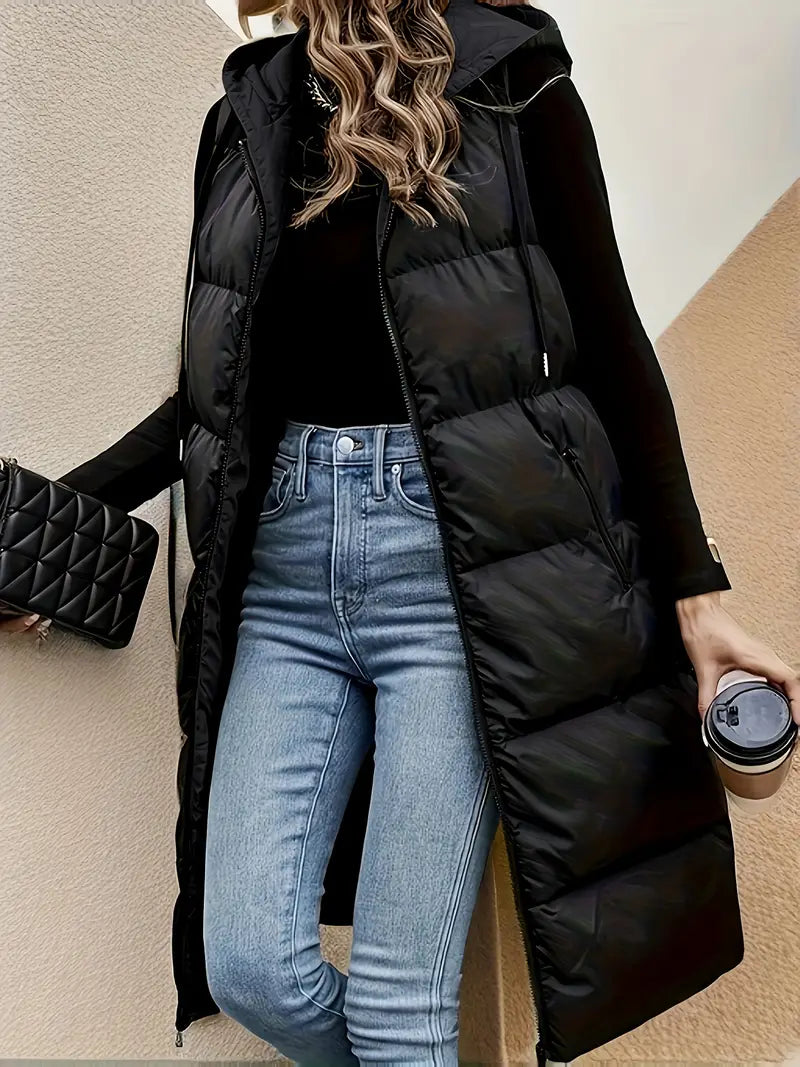 Dieses lange, gepolsterte Weste für Damen verbindet zeitlosen Stil mit praktischer Funktionalität. Sie bietet sowohl Wärme als auch Komfort und schützt Sie zuverlässig in der kalten Jahreszeit. Der Reißverschluss sorgt für einen einfachen Zugang, während die verstellbare Kapuze und die Reißverschlusstaschen zusätzlichen Schutz und Stauraum bieten, perfekt für den Winter.