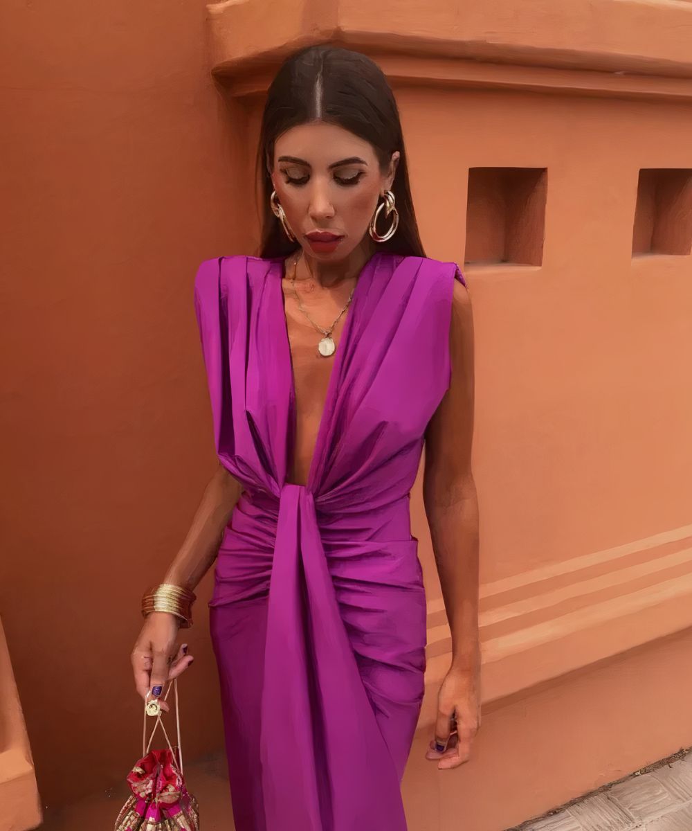 Setzen Sie mit dem Caro Partykleid ein modisches Statement. Der gewagte, tiefe Ausschnitt verleiht Ihrem Look eine elegante, mutige Note. Aus hochwertigen Materialien gefertigt, bietet es sowohl Komfort als auch eine schmeichelhafte Passform, perfekt für besondere Anlässe. Kombinieren Sie es mit hohen Absätzen und auffälligen Accessoires, um Ihren Abendstil zu vervollständigen.