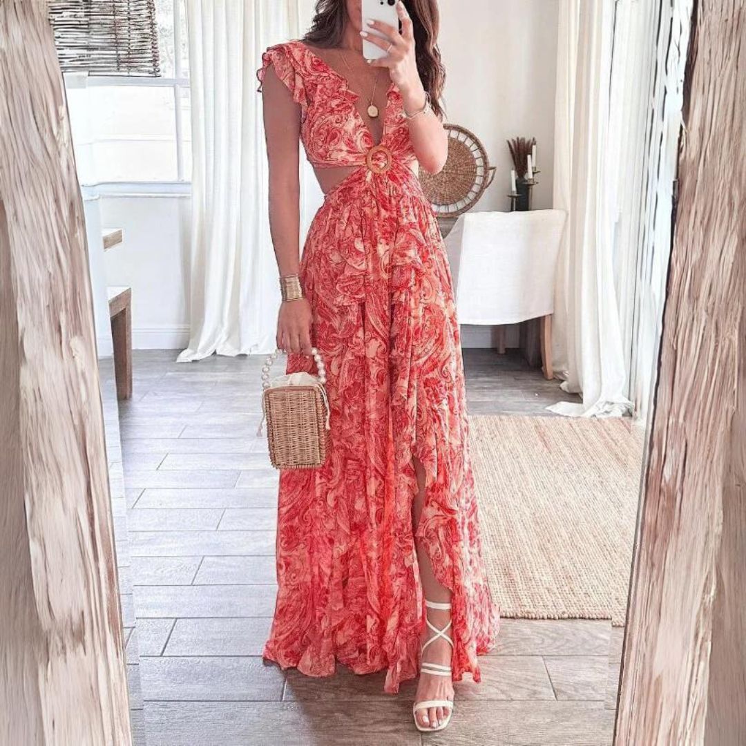 Das Coralie Maxikleid mit Schlitz vereint Anmut und zeitlose Eleganz. Mit seinen Flatterärmeln und einem zarten Print, der mit Rüschen verziert ist, verleiht es Ihrem Look einen romantischen, femininen Touch. Der geschickt platzierte Schlitz sorgt für anmutige Bewegungen und unterstreicht die Eleganz des Kleides, sodass jeder Schritt Selbstbewusstsein ausstrahlt.