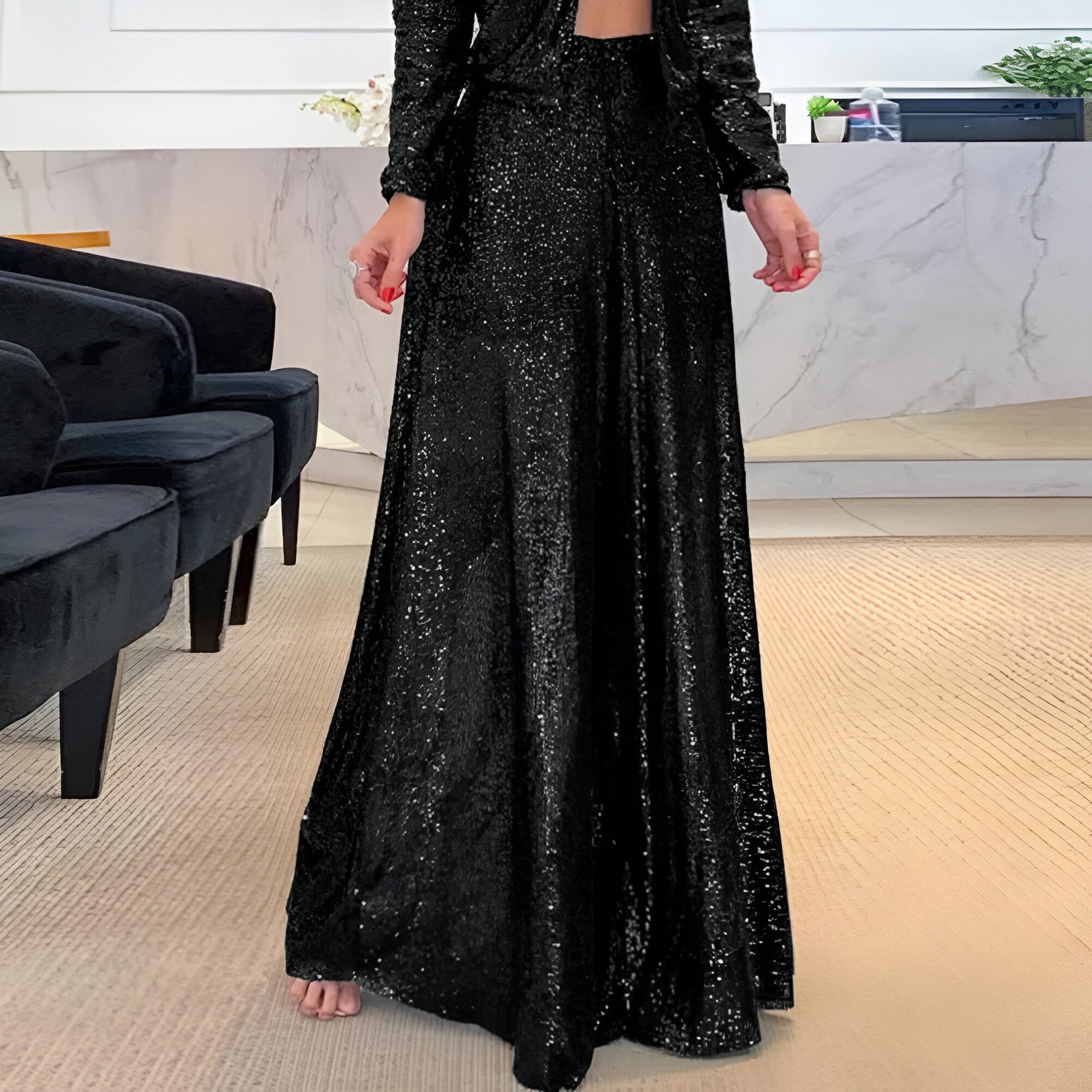 Stell dir vor, du schlüpfst in eine Hose, die nicht nur perfekt sitzt, sondern dich auch wie den Star des Abends fühlen lässt. Diese hochtaillierte, weite Hose mit funkelnden Pailletten wird alle Blicke auf sich ziehen – egal, ob du die Tanzfläche eroberst oder einen Abend mit Freunden genießt.