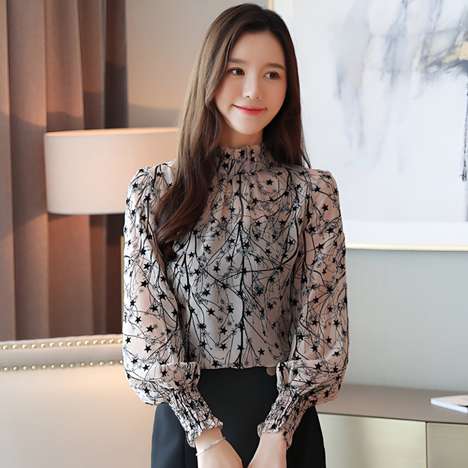 Diese Bluse besteht aus leichtem Chiffon, der sich perfekt auf deiner Haut anfühlt. Der Stehkragen verleiht einen eleganten Touch, während die langen Ärmel dich an kühleren Tagen warm halten.