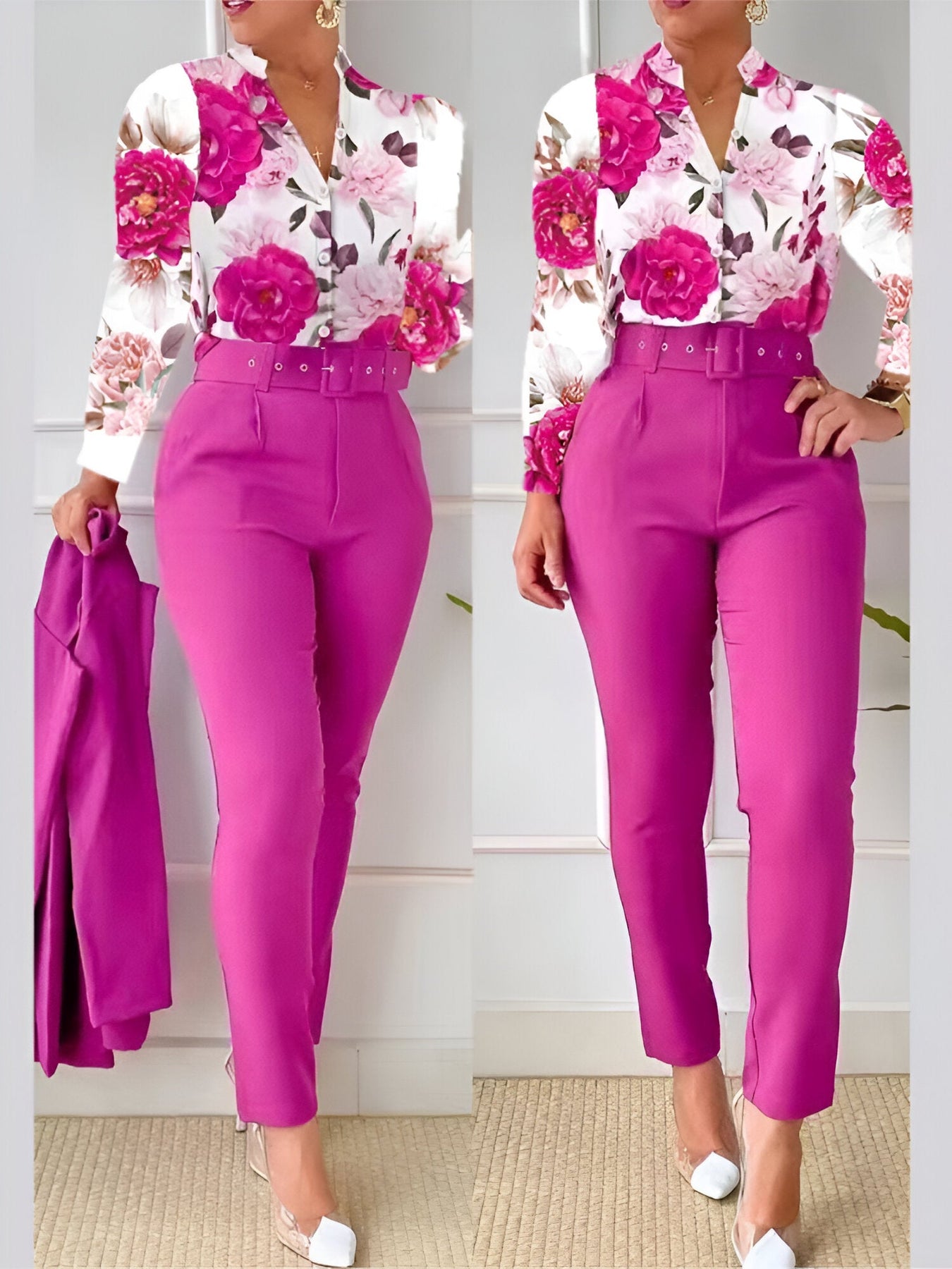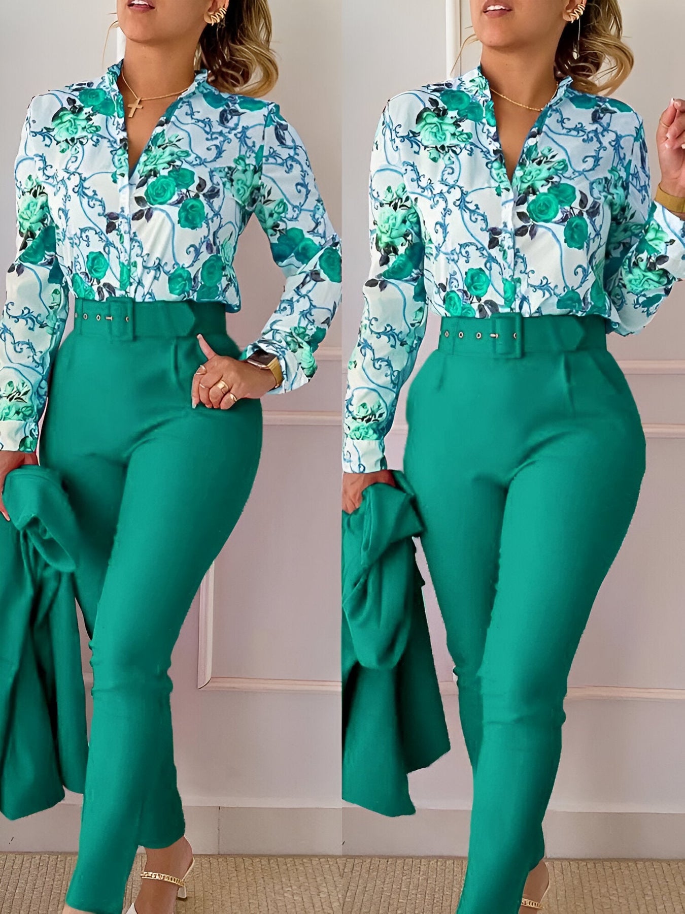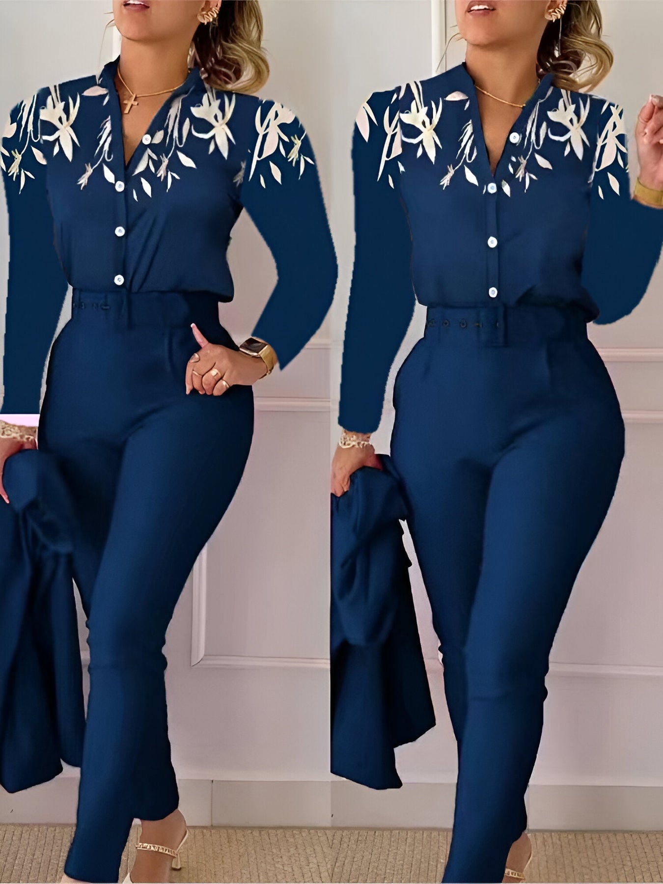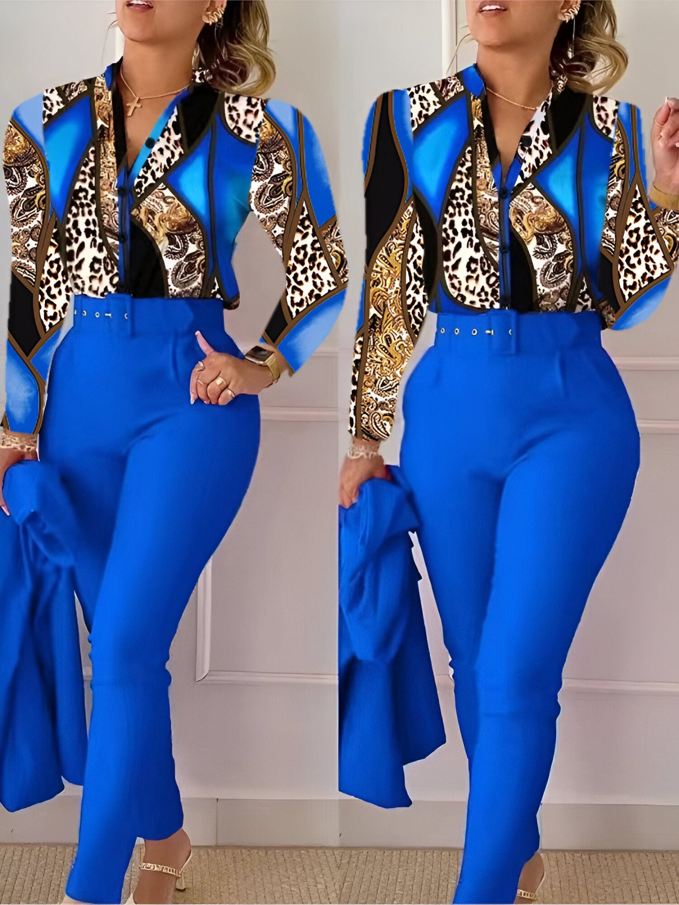Stell dir vor, du trittst mit mühelos stilvollem Look in die Herbstsaison. Dieses Zwei-Teile-Suit-Set, mit dem schmeichelhaften V-Ausschnitt-Top und der High-Waist-Hose, ist perfekt für Arbeit und Freizeit. Der elegante Print verleiht einen Hauch von Raffinesse, während der bequeme Schnitt dafür sorgt, dass du den ganzen Tag über entspannt bleibst. Ob im Büro oder beim Kaffeetrinken mit Freunden, dieses Set lässt dich schick aussehen und selbstbewusst fühlen.