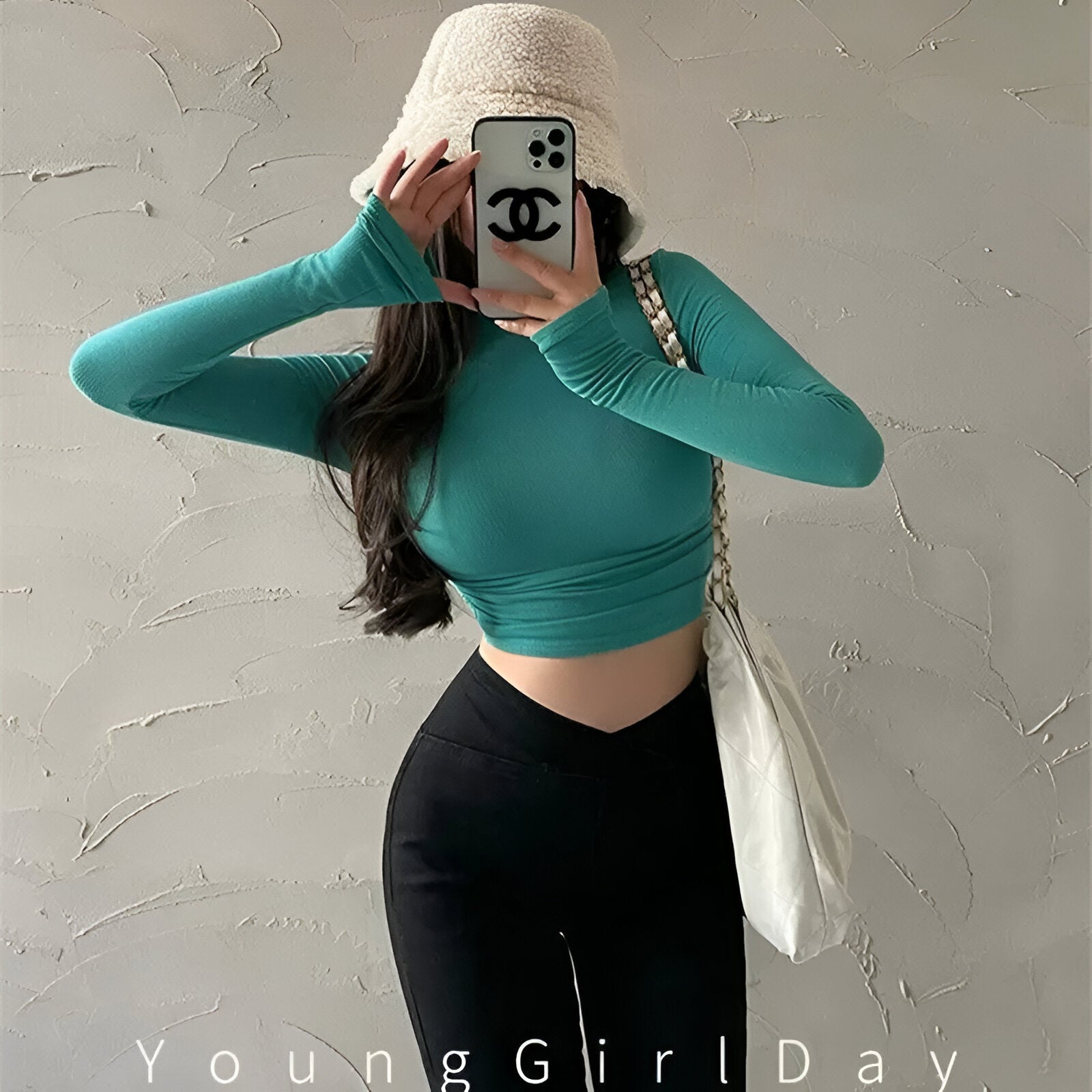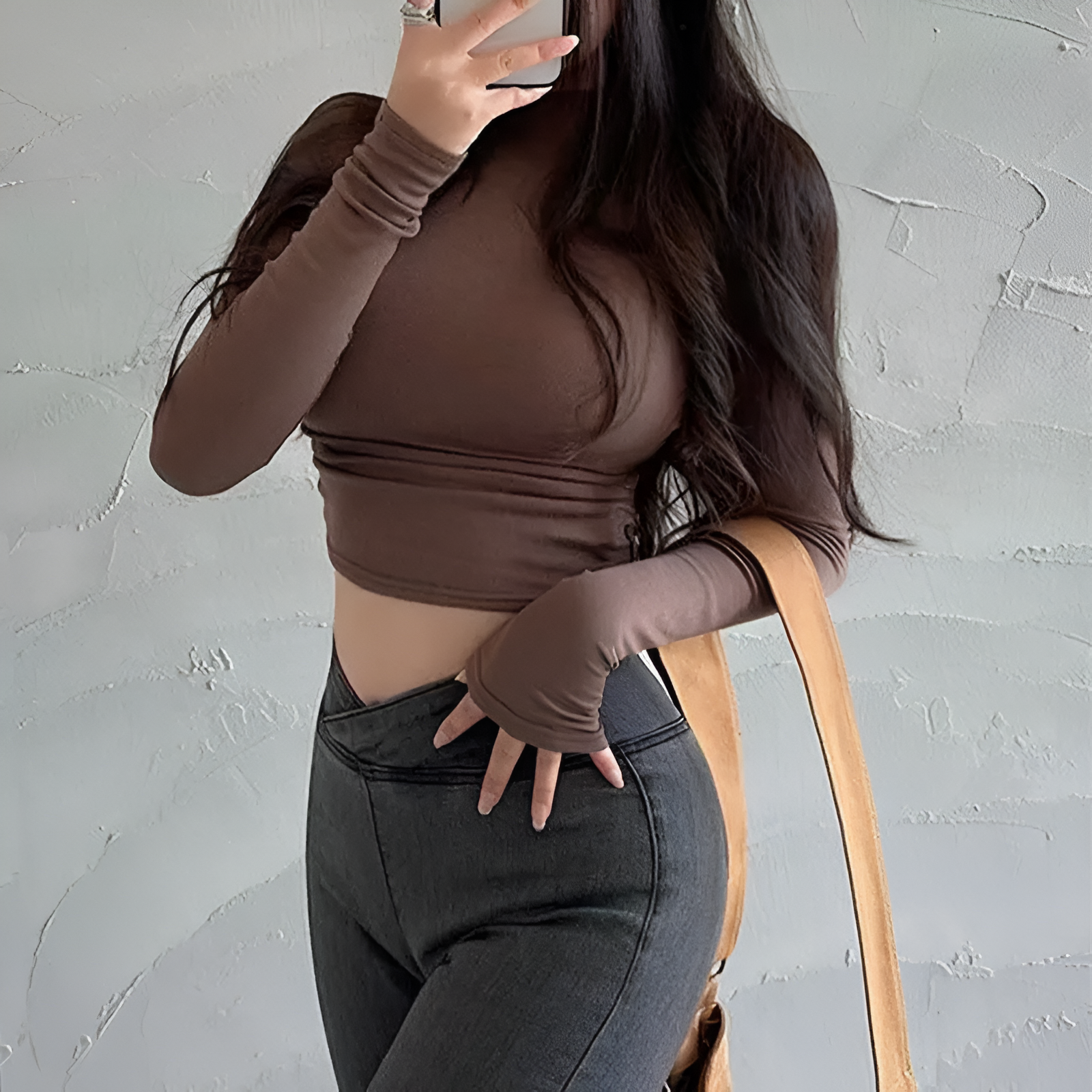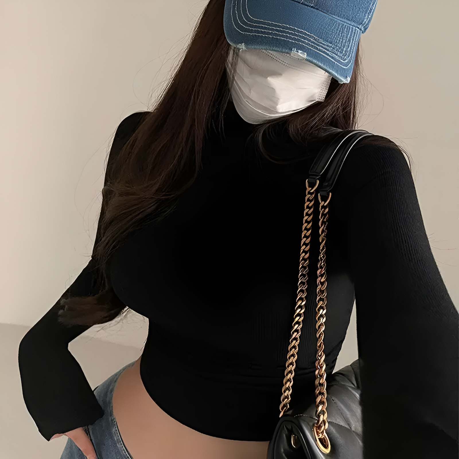 Stell dir vor, du schlüpfst in ein Top, das deinen Stil mühelos ergänzt und jedem Outfit einen schicken Touch verleiht. Dieses cropped Longsleeve mit halbem Polo-/Rollkragen vereint Vintage-Charme mit moderner Funktionalität. Das figurbetonte Design umschmeichelt deinen Körper an den richtigen Stellen, während die zerknitterte Textur für einen entspannten, aber modischen Look sorgt. Ob du es als Schicht für zusätzliche Wärme trägst oder als Einzelstück – dieses Top wird dein Lieblingsstück im Frühling.